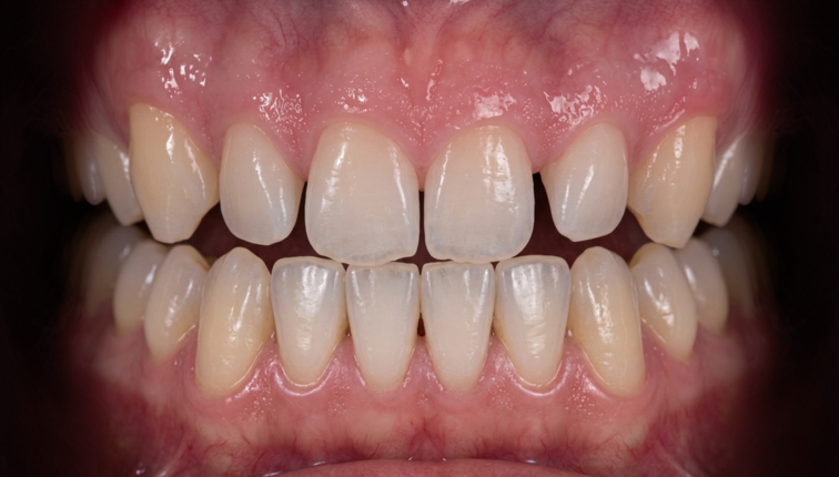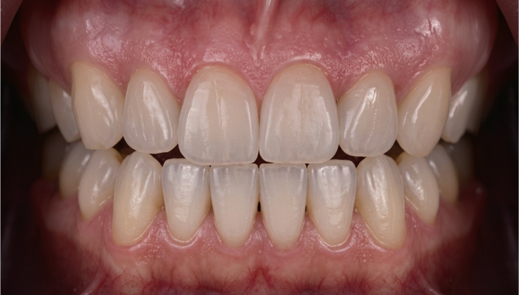 Для создания гармоничной улыбки было выбрано протезирование безметалловыми конструкциями. Верхние зубы от клыка до клыка минимально обточены, выполнено 3D-сканирование. По готовности установлены высокоэстетичные коронки E-max на шесть зубов в зоне улыбки. Выбор такого материала позволил добиться максимальной естественности, так как керамика E-max имитирует свойства натуральной эмали. В ходе работы удалось закрыть все щели и скорректировать форму зубов, сделав улыбку ровной и симметричной.