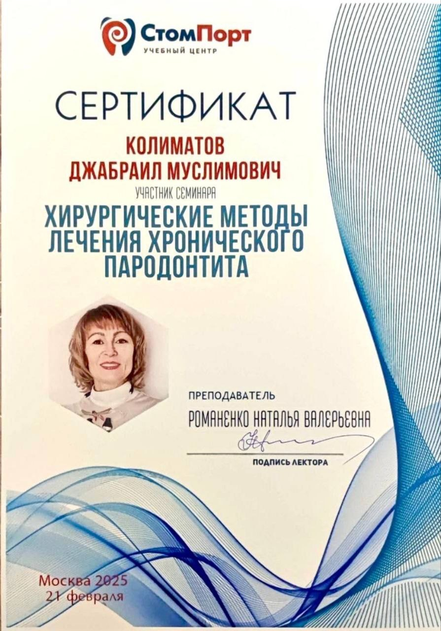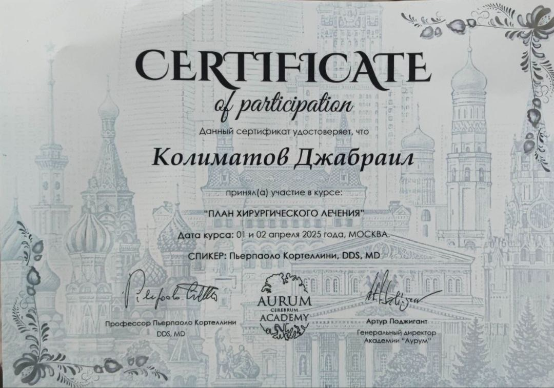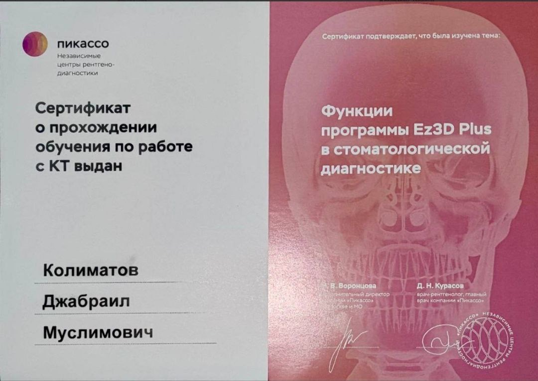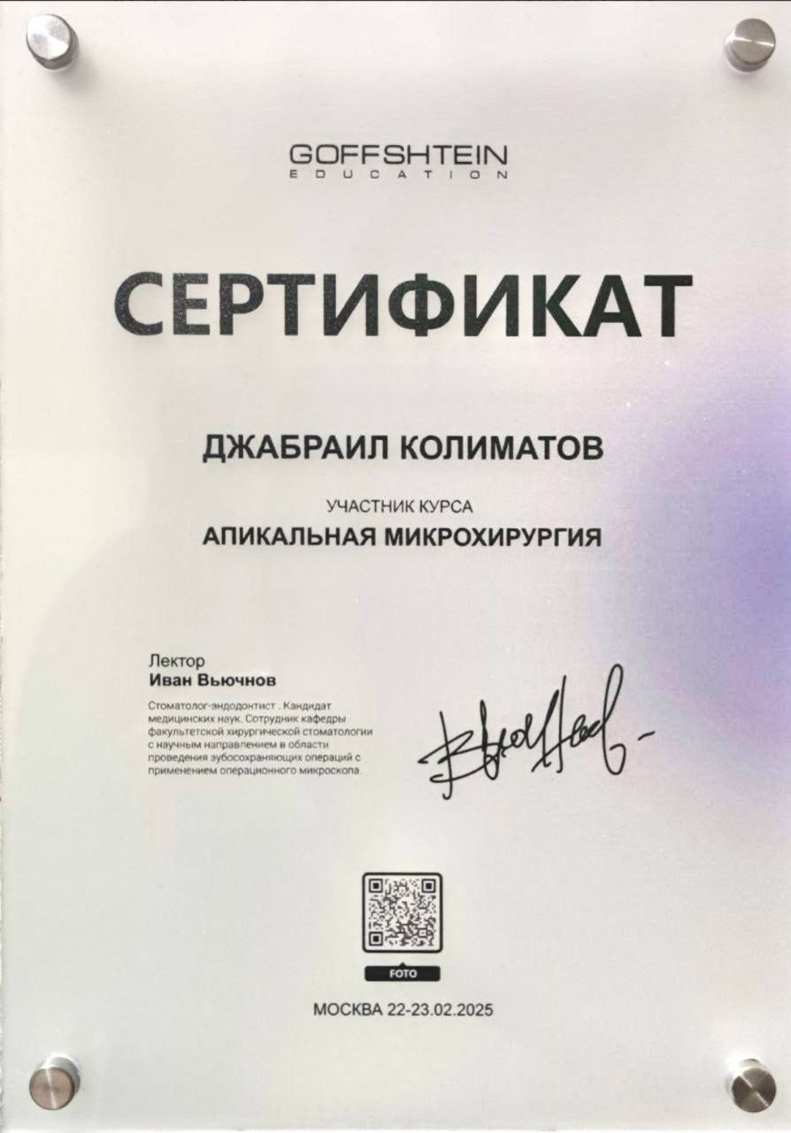 Колиматов Джабраил Муслимович - хирург-имплантолог сети научных стоматологий «Дантистофф». Окончил Северо-Осетинскую Государственную Медицинскую Академию.