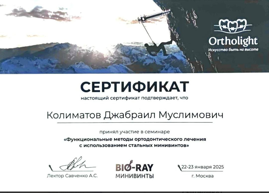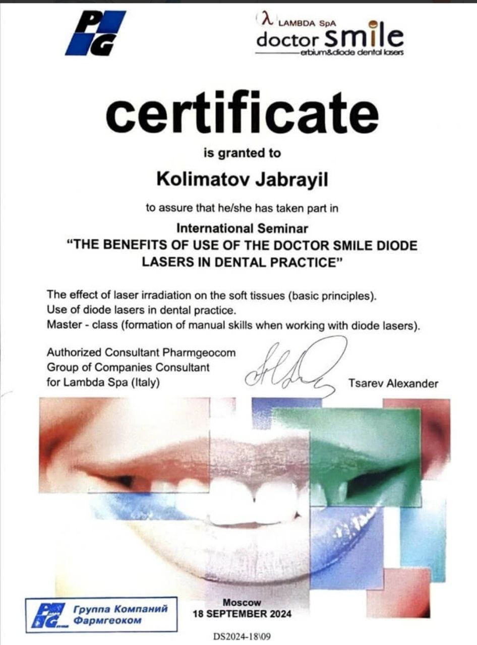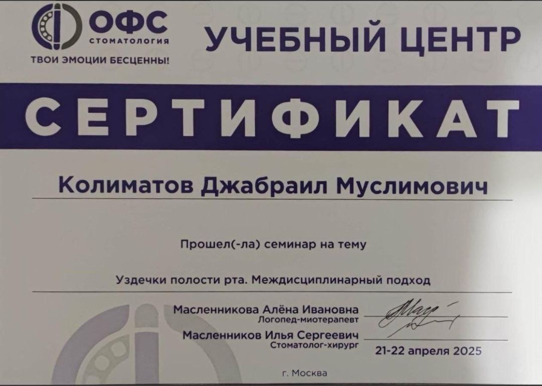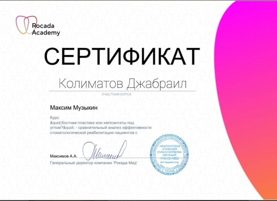 Колиматов Джабраил Муслимович - хирург-имплантолог сети научных стоматологий «Дантистофф». Окончил Северо-Осетинскую Государственную Медицинскую Академию.