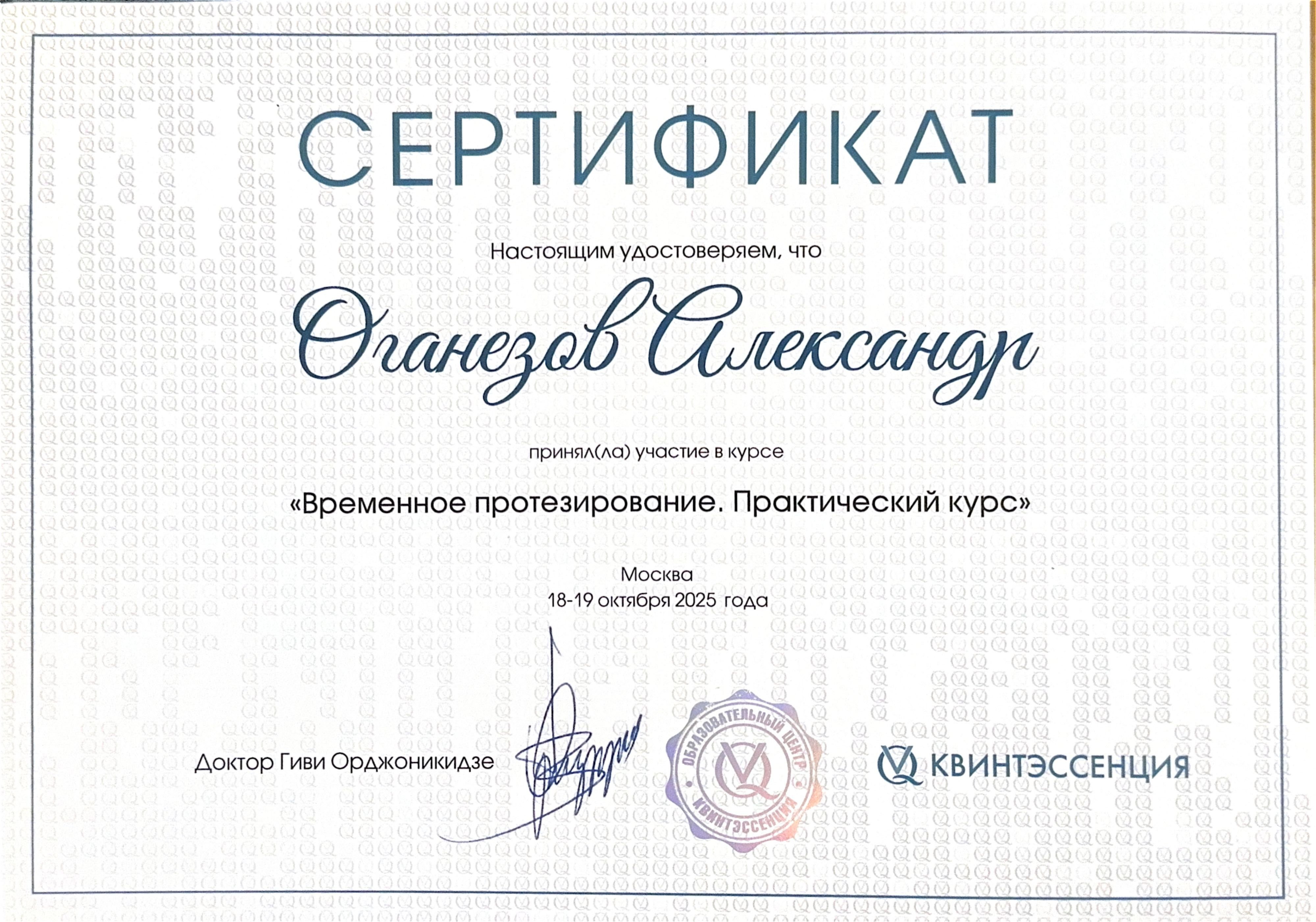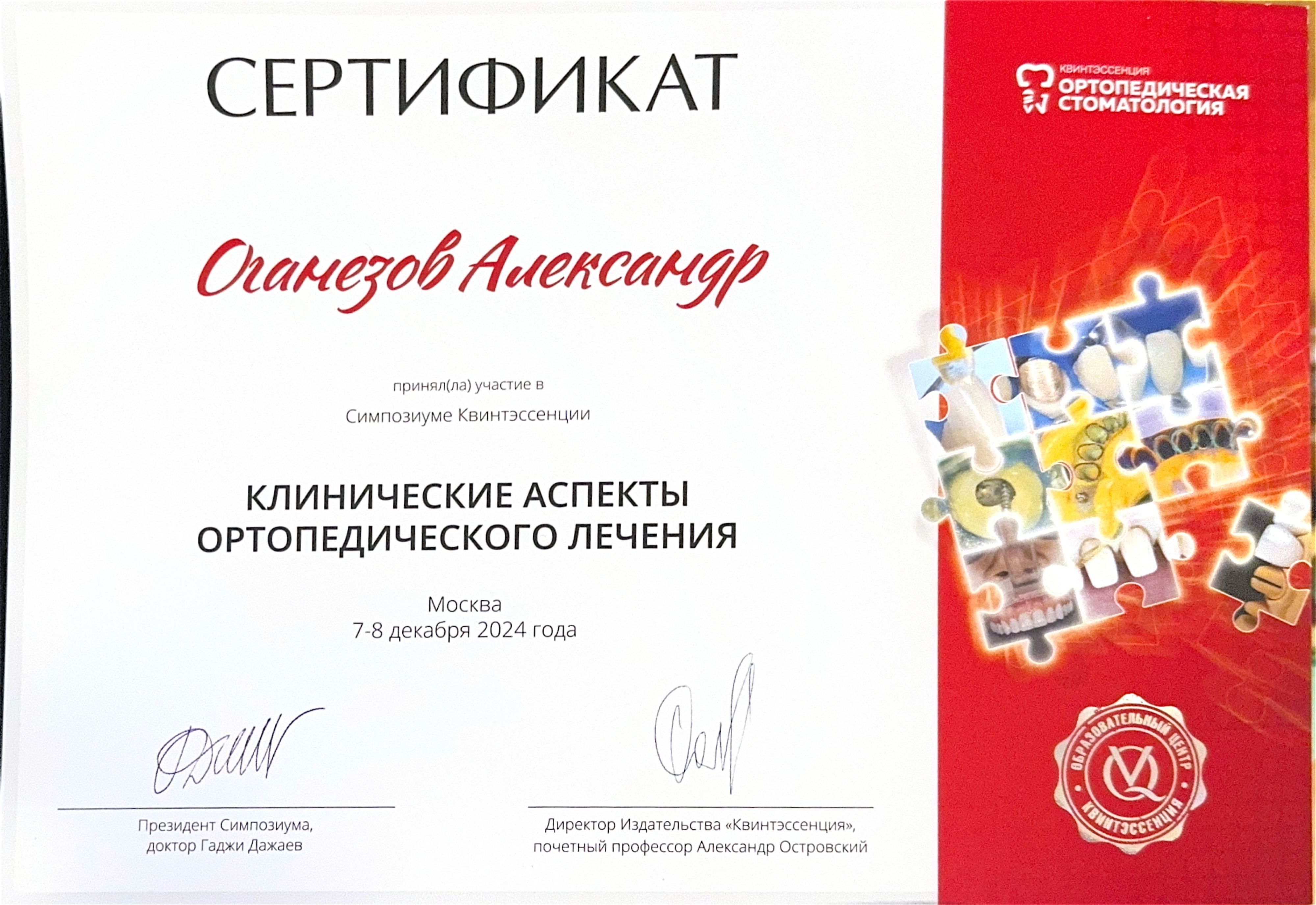 Оганезов Александр Георгиевич — стоматолог-ортопед сети научных стоматологий «Дантистофф», окончил Московский государственный медико-стоматологический университет имени А. И. Евдокимова. Повышал квалификацию по специальности «Ортопедическая стоматология» в Центральной государственной медицинской академии Управления делами Президента РФ.