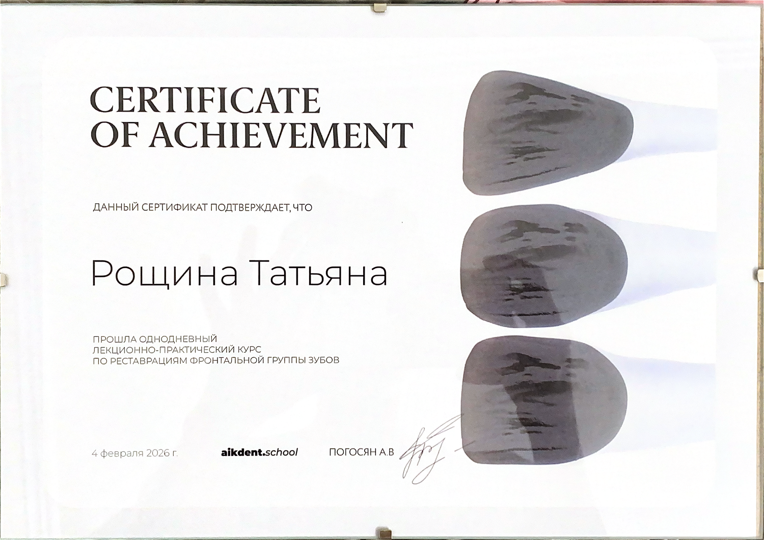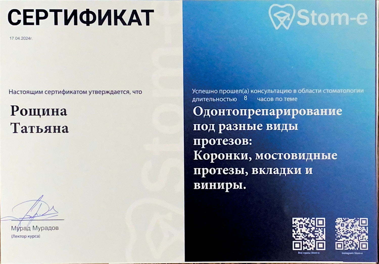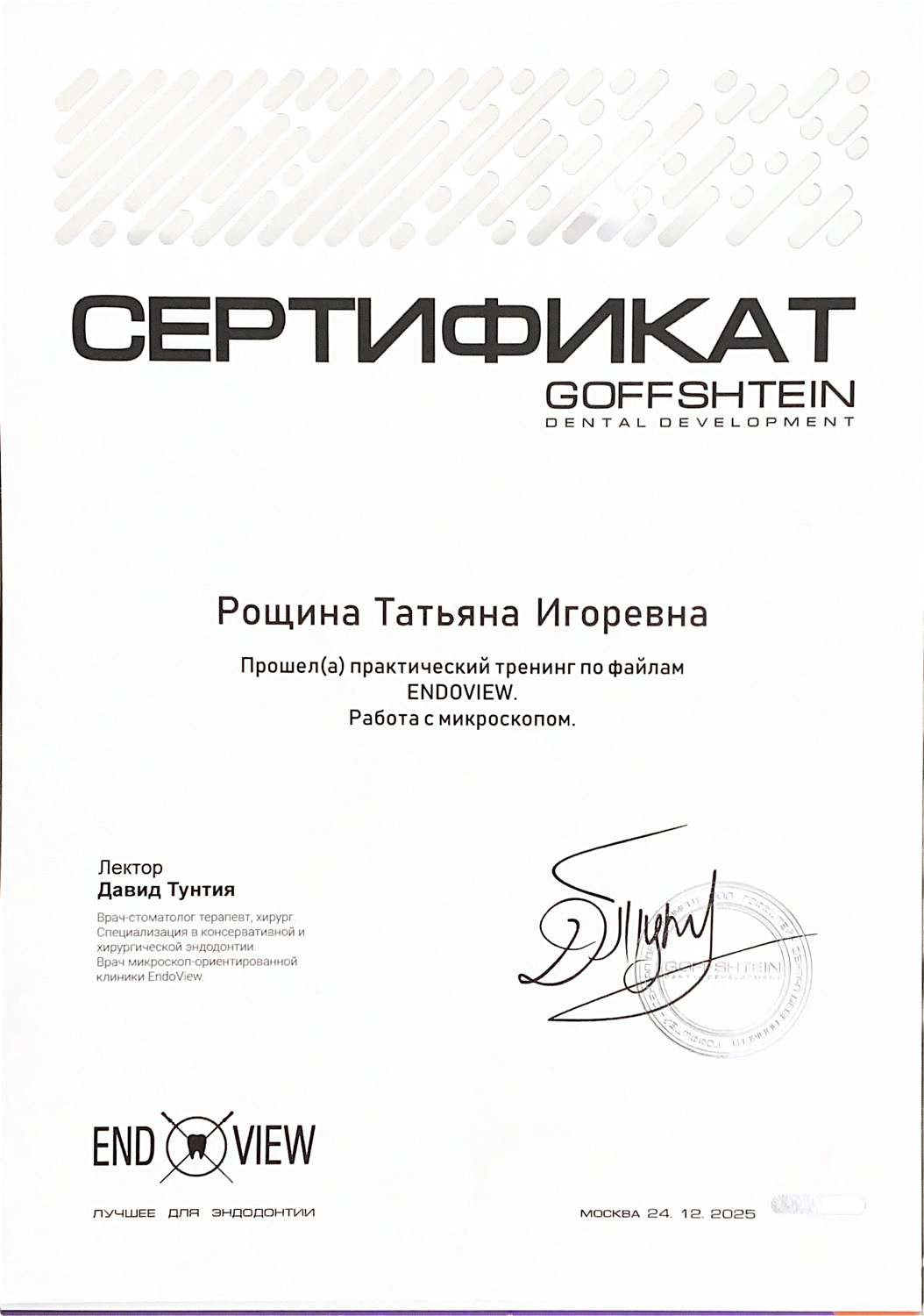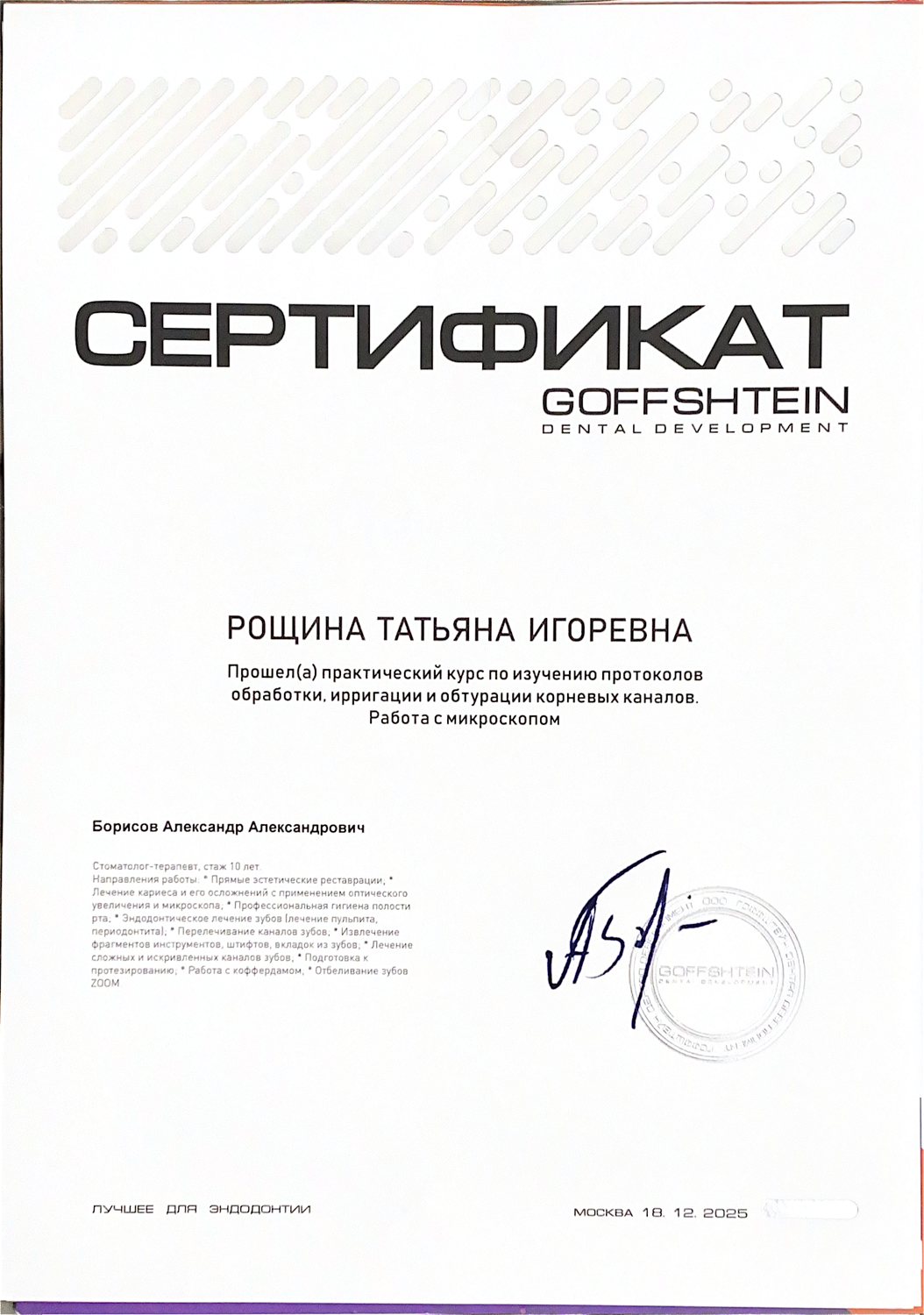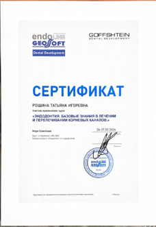 Рощина Татьяна Игоревна - стоматолог-терапевт сети научных стоматологий «Дантистофф». Окончила «Чувашский государственный университет им. И.Н. Ульянова» по специалитету «Стоматология». Обучалась в ординатуре «Московского областного научно-исследовательского клинического института имени М.Ф. Владимирского»