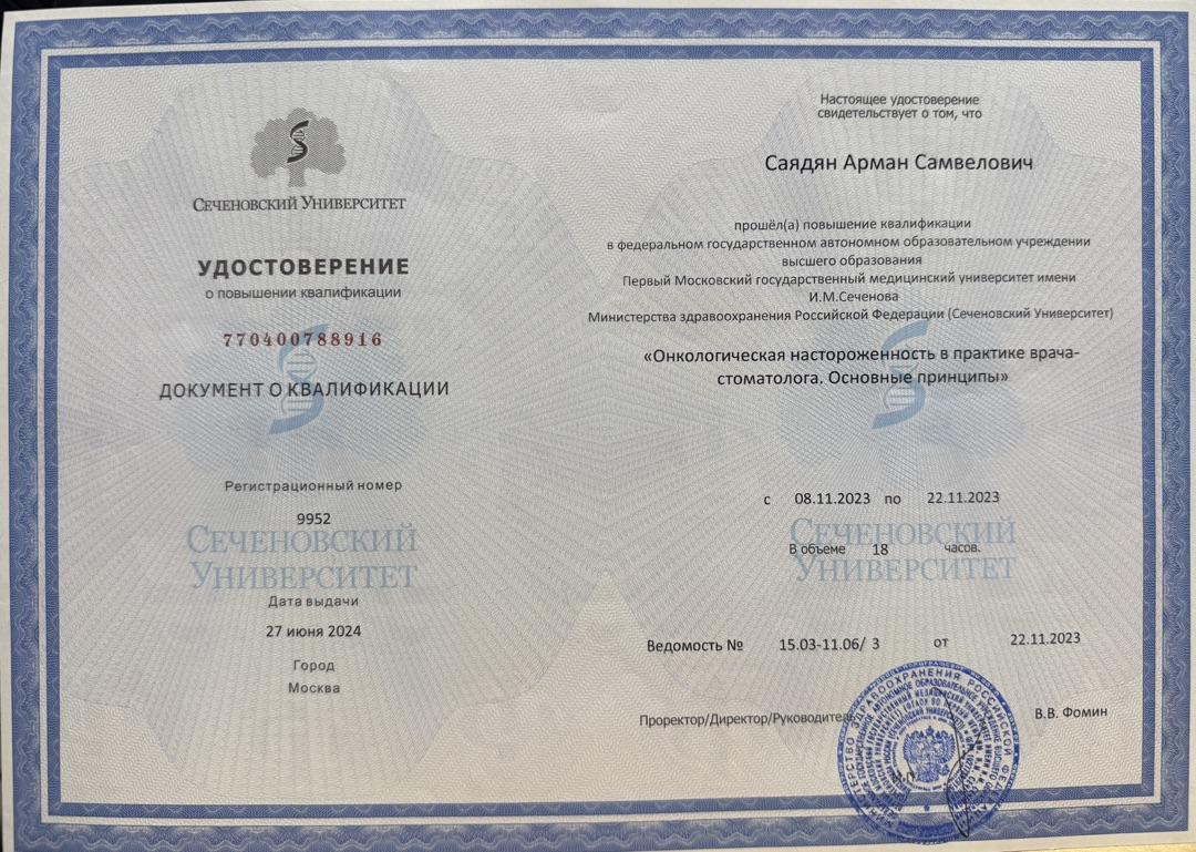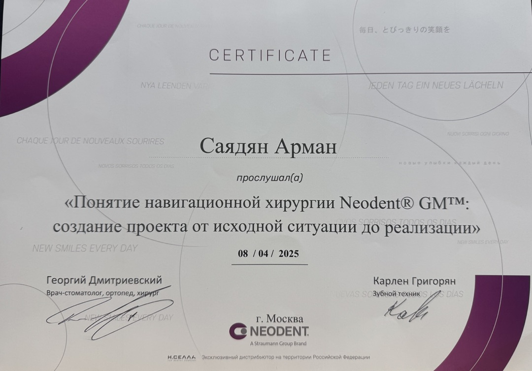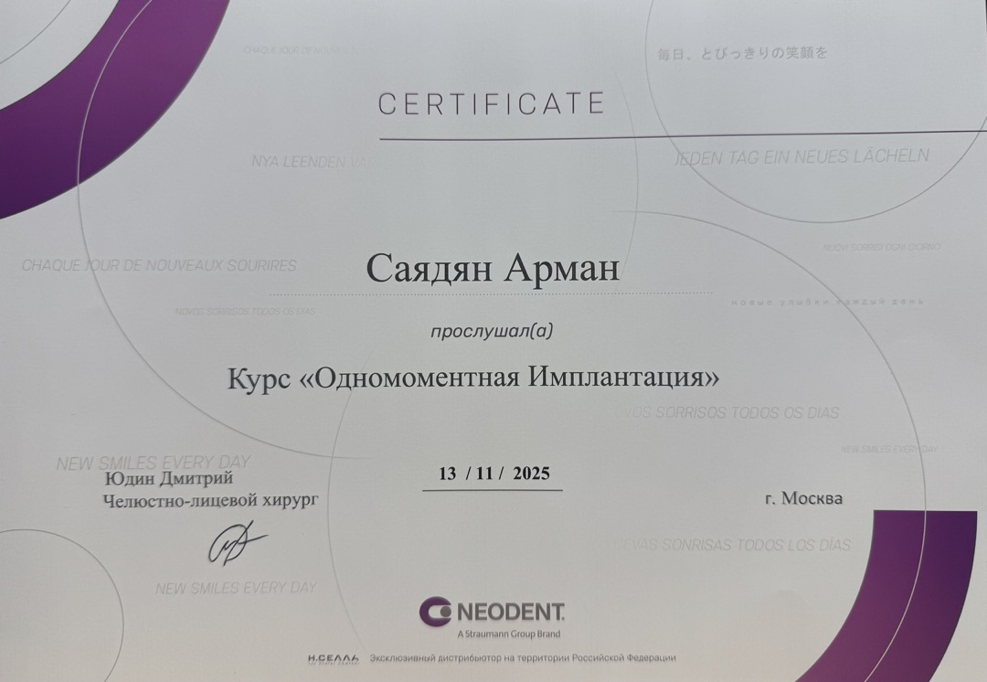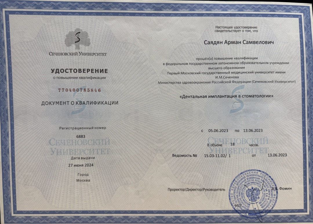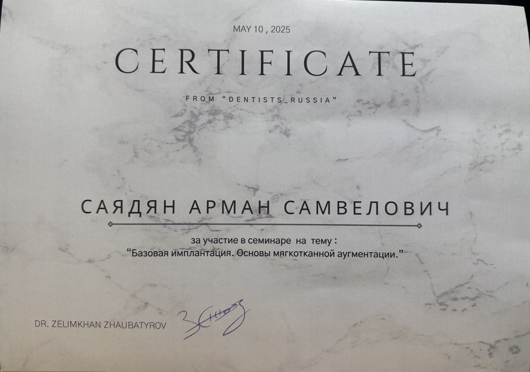 Саядян Арман Самвелович - хирург-имплантолог сети научных стоматологий «Дантистофф». Окончил Первый Московский государственный медицинский университет имени И . М . Сеченова