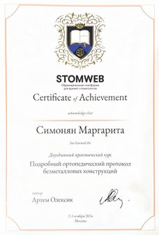 Симонян Маргарита Эдуардовна — стоматолог-ортопед сети научных стоматологий «Дантистофф». Окончила Московский государственный медико-стоматологический университет имени А. И. Евдокимова. Там же обучалась в ординатуре, получила специальность «Стоматология ортопедическая».