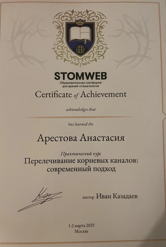 Арестова Анастасия Андреевна - стоматолог-терапевт сети научных стоматологий «Дантистофф». Окончила Самарский государственный медицинский университет.